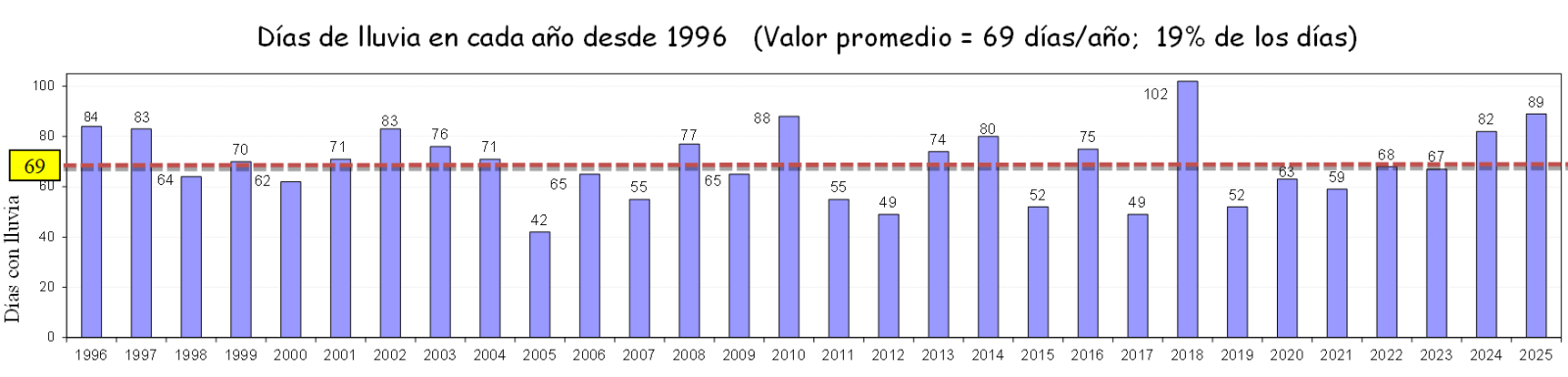 En 2025 hubo 89 días de precipitaciones, el segundo récord histórico tras los 102 de 2018. “En general llueve el 19 % de los días del año, independientemente de la cantidad”, comenta Ángel
