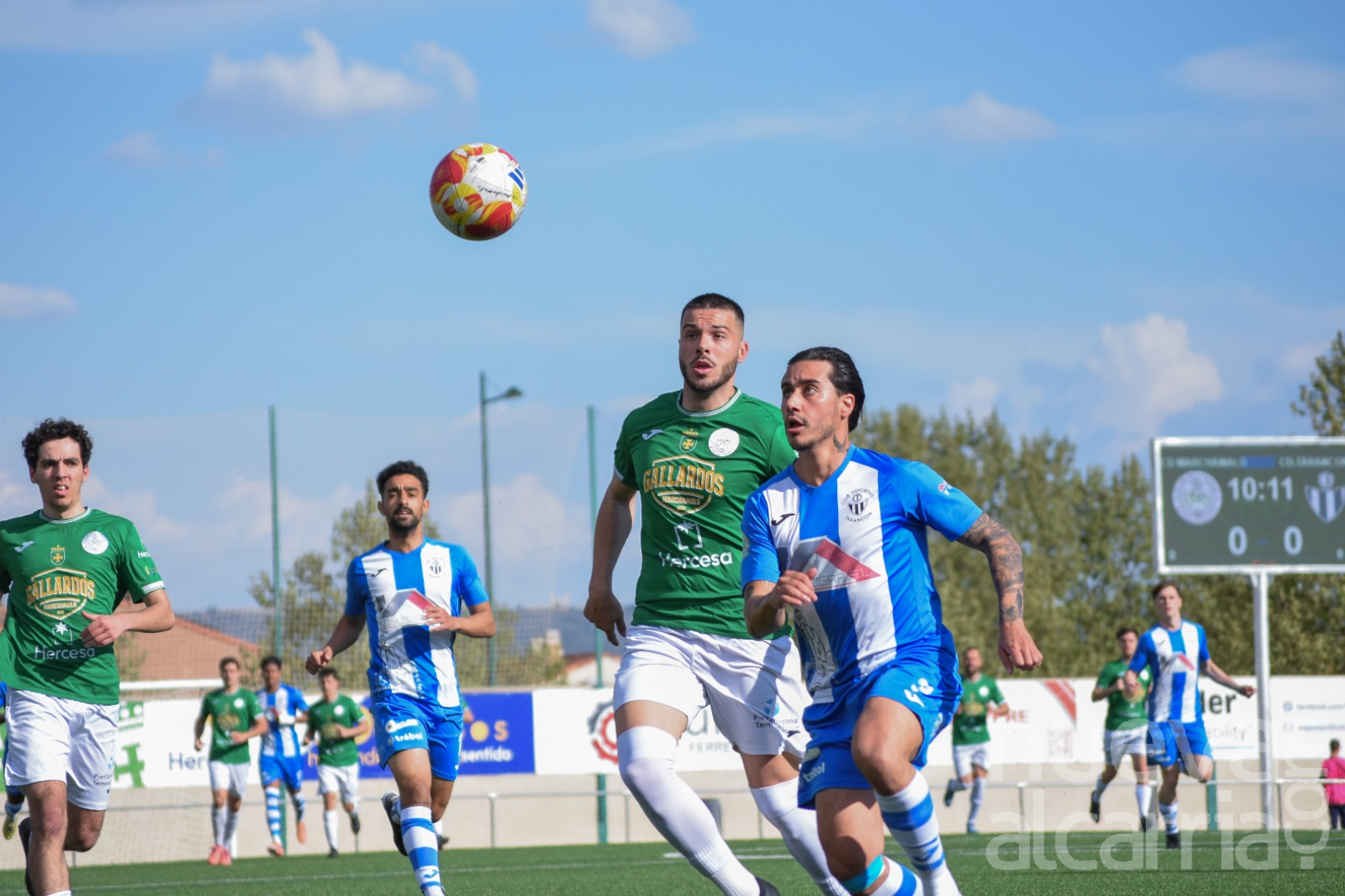 Pronto quedó patente el dominio visitante de cara al objetivo de los tres puntos dentro de su pugna con el Calvo Sotelo y el Toledo por el primer puesto de la tabla. El entrenador del conjunto gallardo, Emilio López, situó bloque defensivo medio para no permitir las temidas transiciones, mientras que las bazas ofensivas gallardas quedaron supeditadas a los contragolpes. Manu Navarro, exjugador del Marchamalo, abandonó el encuentro por lesión a los ocho minutos. La única oportunidad clara del primer período fue un cabezazo del local Víctor dentro del área pequeña repelido por la pierna del guardameta Mario.