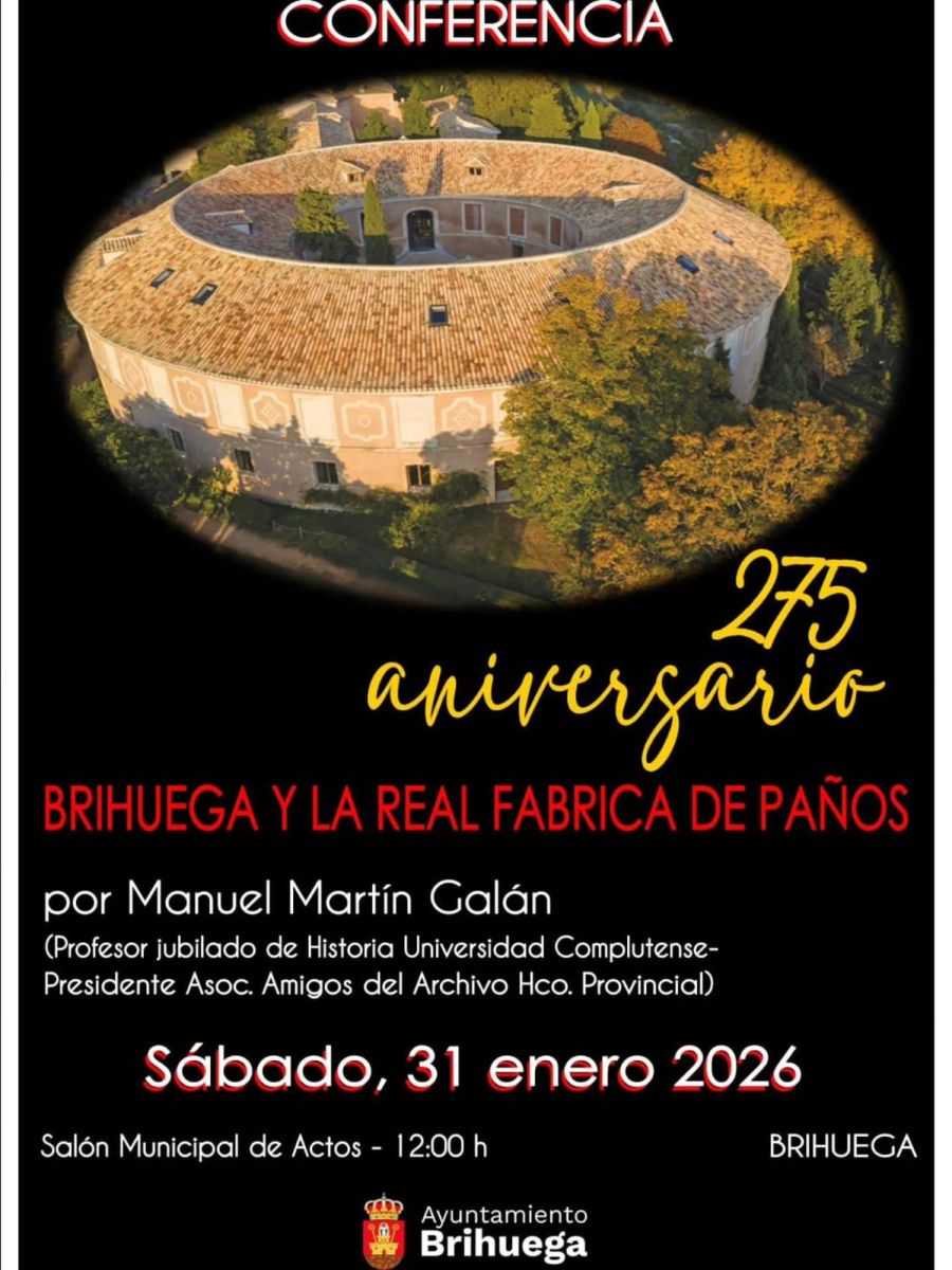 Brihuega conmemora el 275 aniversario de la Real Fábrica de Paños con una conferencia dedicada a recorrer su historia, su impacto económico y su legado cultural. El acto se celebrará el sábado 31 de enero, a las 12.00 horas, en el Salón Municipal de Actos, y estará a cargo del historiador Manuel Martín Galán, profesor titular jubilado de Historia Moderna de la Universidad Complutense de Madrid.