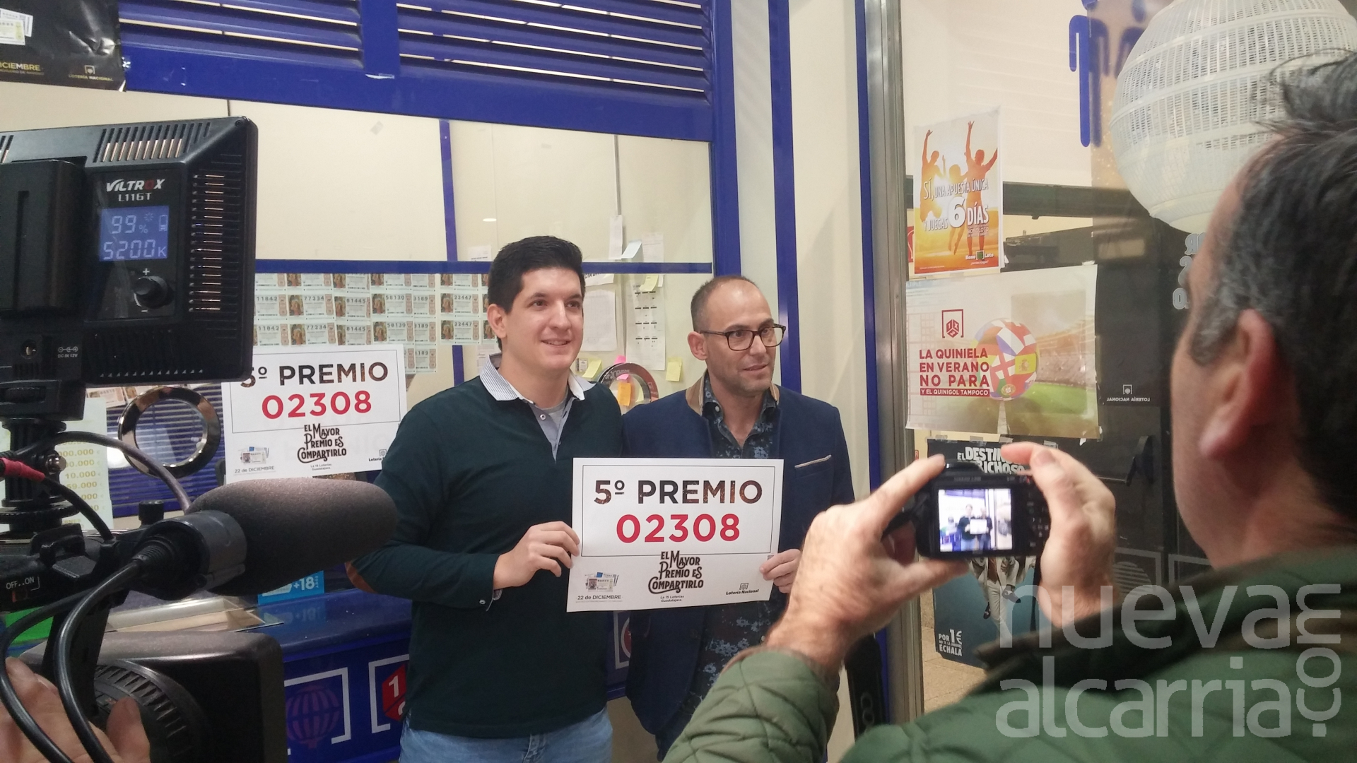 Este punto de venta se ha estrenado así en la concesión de premios del Sorteo Extraordinario de la Lotería Nacional. En torno al mediodía salía uno de los 5º Premios, el 2.308, y con él llegaba la alegría a esta administración que abrió el 9 de abril de 2012. Han sido tres décimos, vendidos por máquina, un total de 18.000 euros, pero que ha llenado de ilusión a los gerentes, Fernando Cebrián y Fernando de la Cueva, que no dudaron en brindar con champán por esta buena nueva.