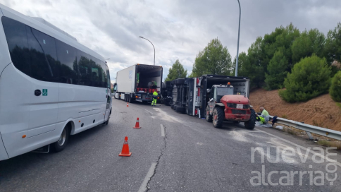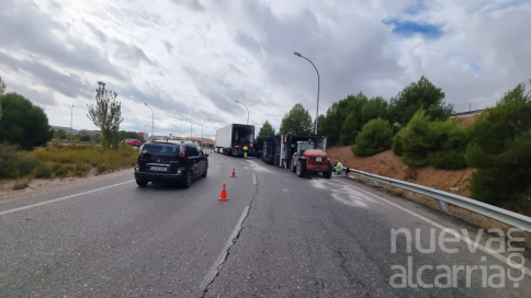 Un tráiler de grandes dimensiones ha volcado esta madrugada mientras tomaba la rotonda que da acceso a la Ronda Norte de Guadalajara, tras ser desviado por las obras que se están llevando a cabo en la A-2.