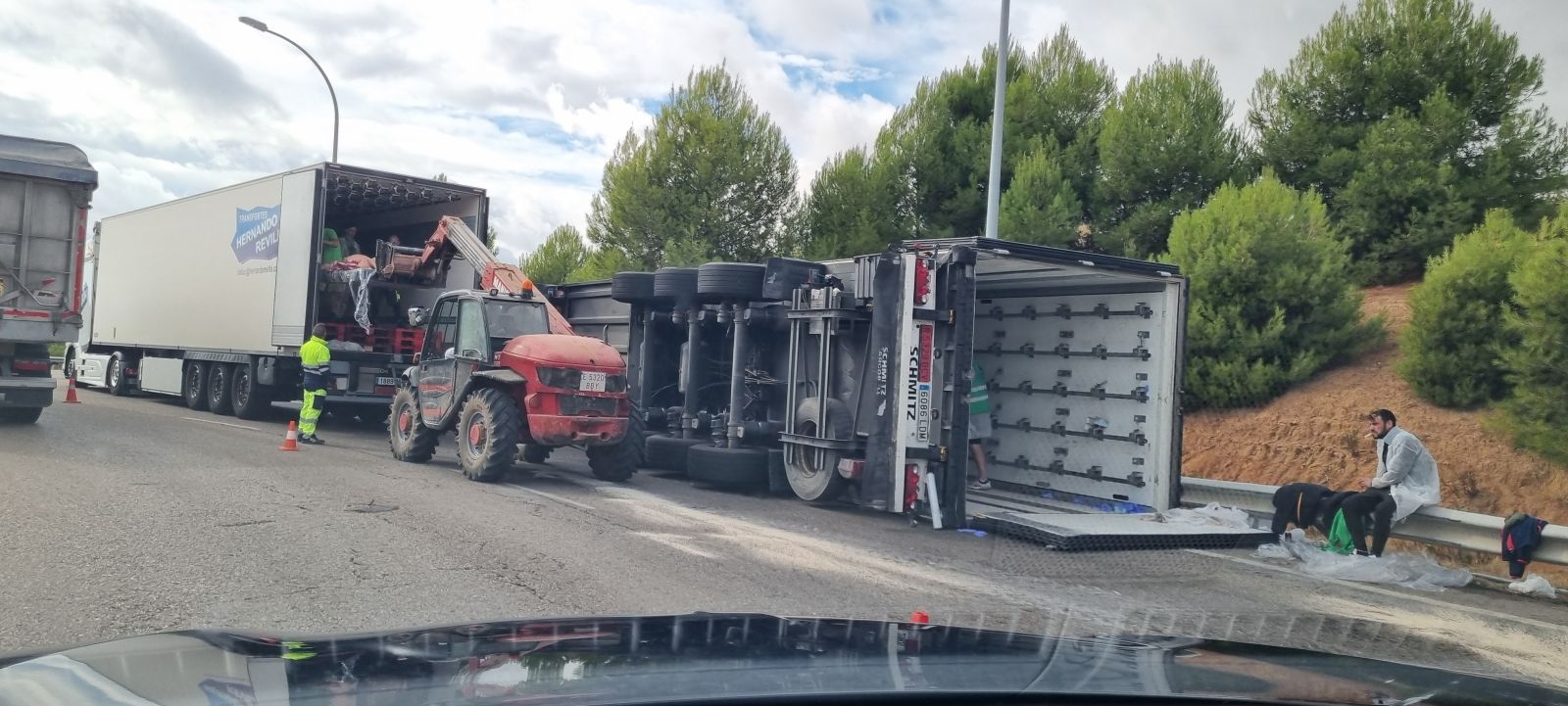 Un tráiler cargado con productos cárnicos vuelca en la rotonda de acceso a la Ronda Norte