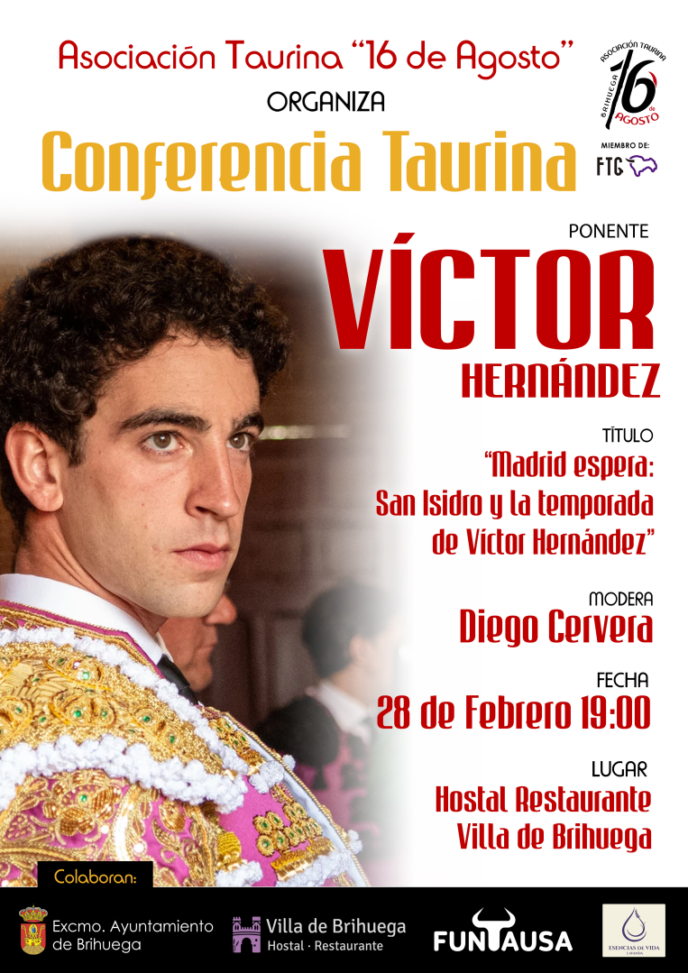 La Asociación Taurina “16 de Agosto” de Brihuega continúa con su intensa actividad cultural y ha programado para este fin de semana una cita de calado para los aficionados. El matador de toros Víctor Hernández, uno de los nombres con mayor proyección del escalafón actual, será el protagonista de una conferencia en la que analizará su trayectoria y los compromisos clave de este año.