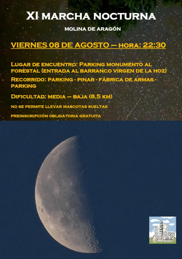 El próximo viernes 8 de agosto, a partir de las 22:30 horas, Molina de Aragón será el escenario de la XI Marcha Nocturna. Los participantes se reunirán en el parking del Monumento al Forestal, ubicado en la entrada al Barranco Virgen de la Hoz.
