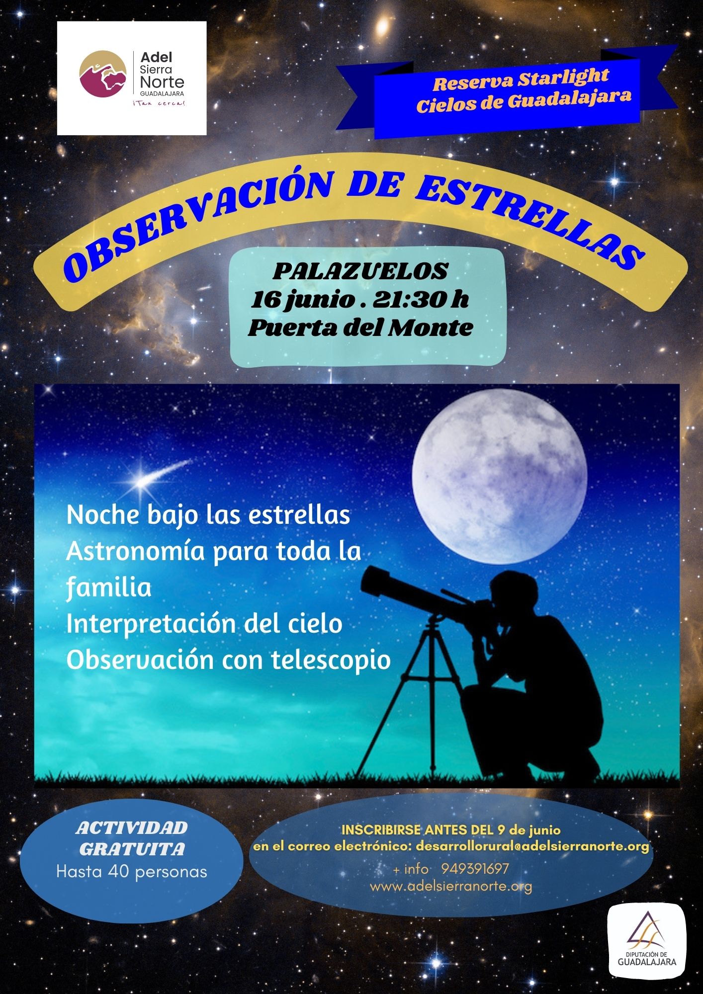 23/05/2023 / 15:47El Grupo de Acción Local, ADEL Sierra Norte, como una más de sus actuaciones de puesta en valor del territorio y con el objetivo de promocionar la certificación de toda la comarca como 'Reserva StarLight Cielos de Guadalajara' convoca cuatro nuevas veladas astronómicas en diferentes localidades de la Sierra Norte, en otros tantos viernes de los meses de junio y julio.